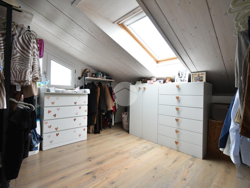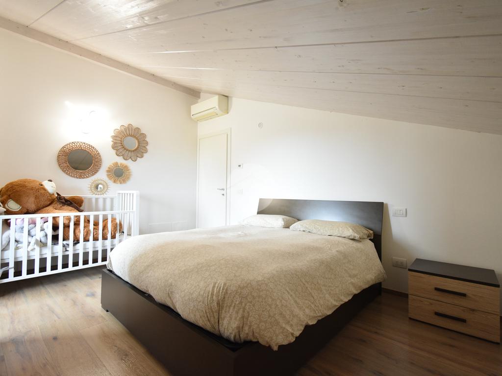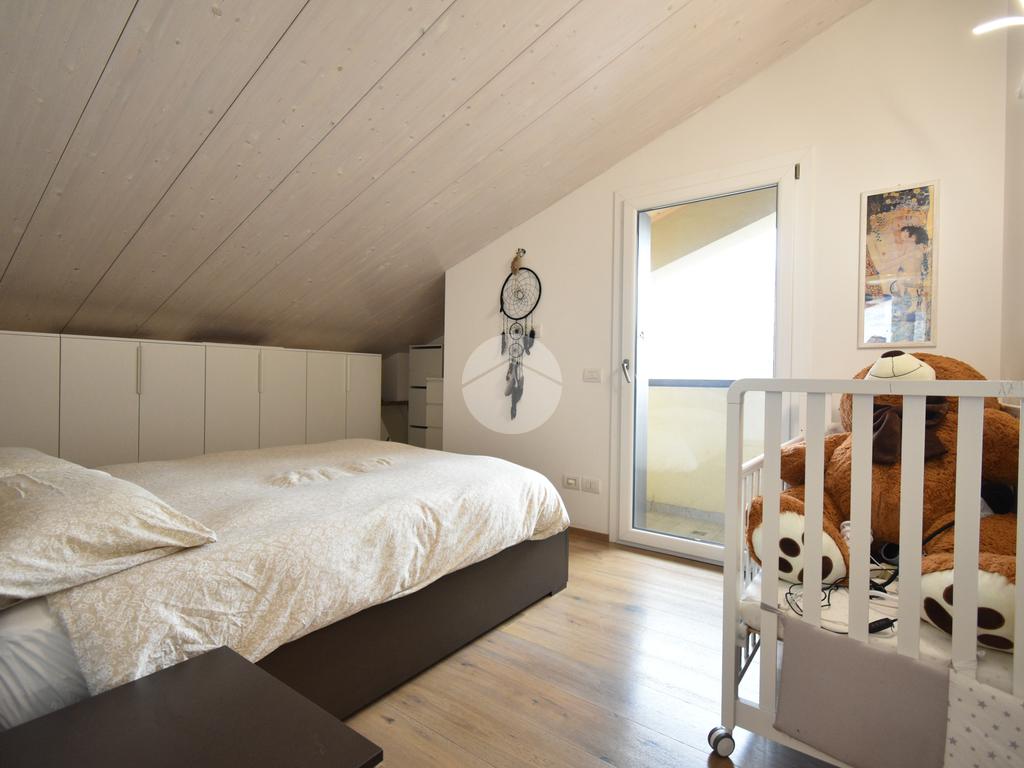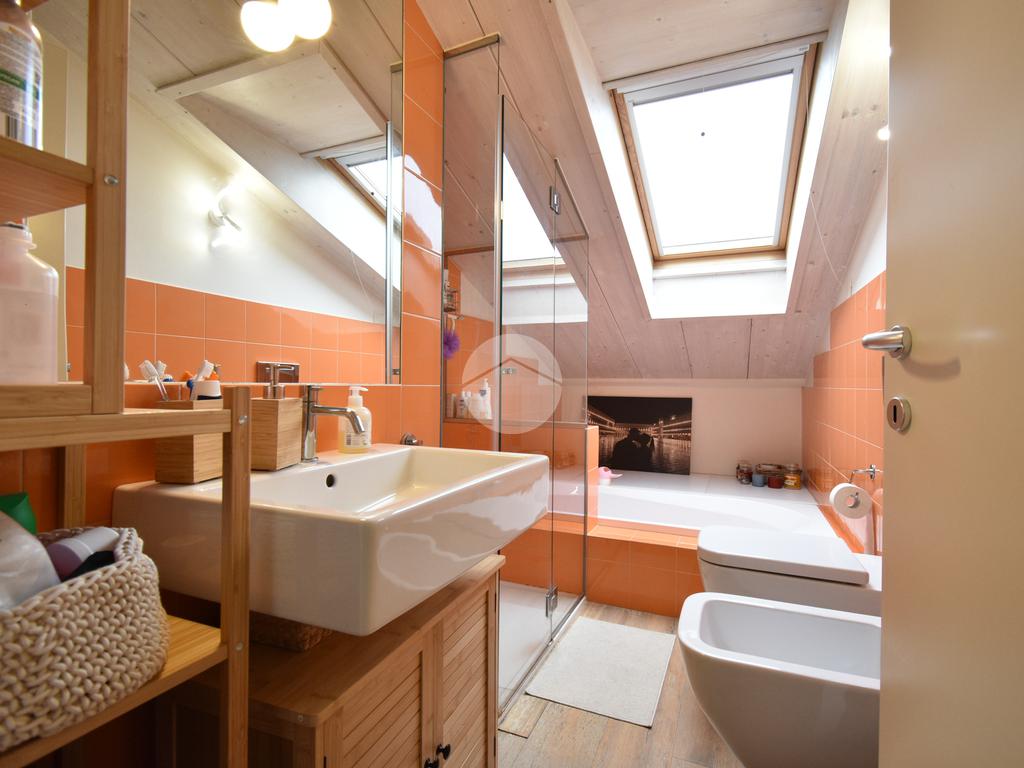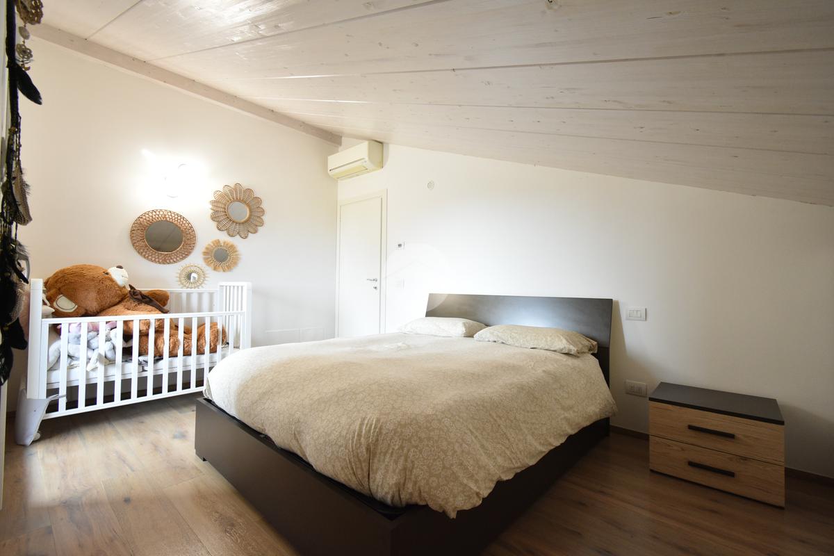 Attraverso una scala interna si accede alla zona notte mansardata, caratterizzata da soffitti in legno chiaro con falde inclinate, dettaglio che rende l’ambiente caldo e accogliente. Il piano è composto da due camere e da un secondo bagno con box doccia e vasca.